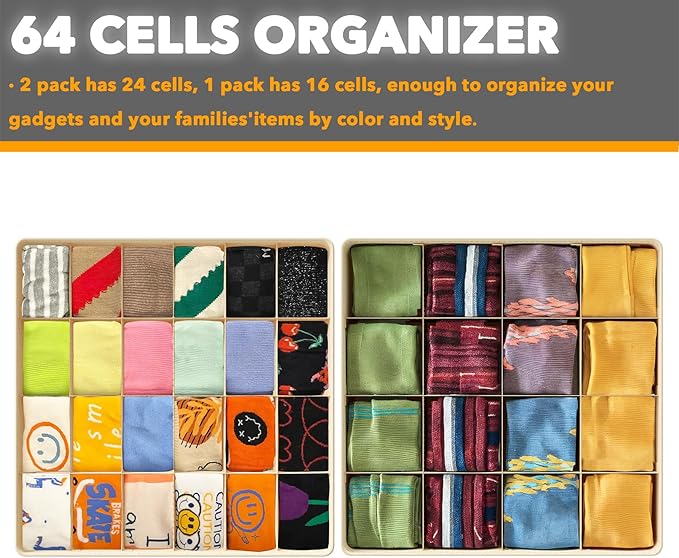 - 64 Cells Underwear Organizer: 2 pack has 24 cells, 1 pack has 16 cells, enough to organize your gadgets and your families'items by color and style, manage your life into a neat organised arrangement.