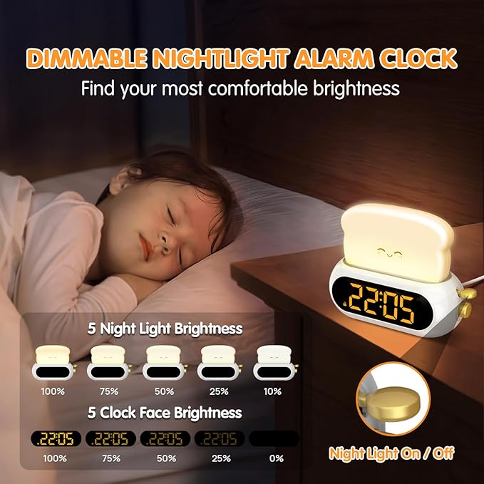 - CUTE ALARM CLOCK WITH NIGHT LIGHT: Our kids alarm clock's display offers 5 brightness levels, ensuring clear visibility without disturbing your slumber. The night light, also with 5 - step brightness adjustment, casts a warm, gentle glow, making bedtime routines more soothing.