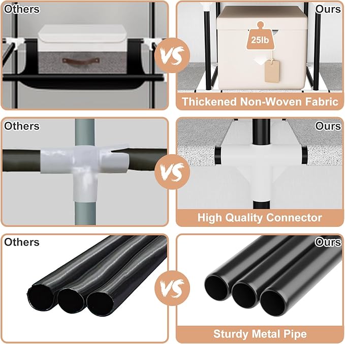 - [Sturdy Portable Wardrobe] This metal wardrobe closet is made of 0.6 inch diameter metal tubes, reinforced plastic connectors, and high-quality non-woven fabrics ensure that the tall wardrobe closet is sturdy and durable, meet your long-term storage needs. The hanging rail holds up to 33 lb, and each shelf is 15 lb, providing a firm support for your clothes. This covered garment rack provides super strong bearing capacity, can be used with confidence