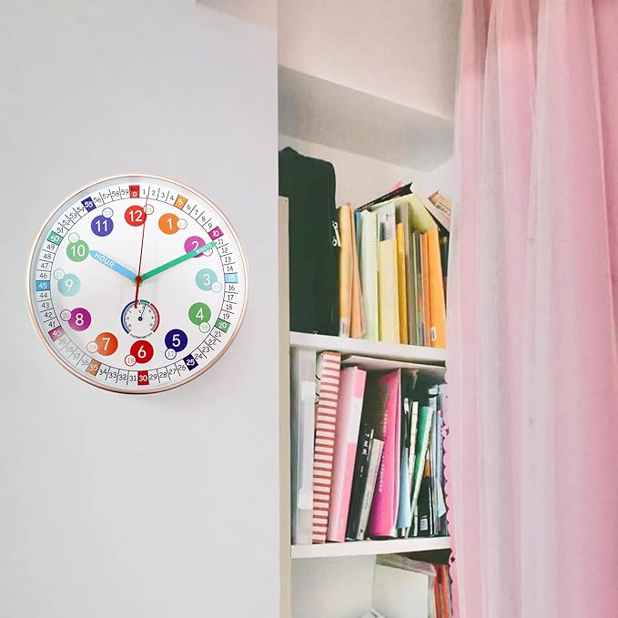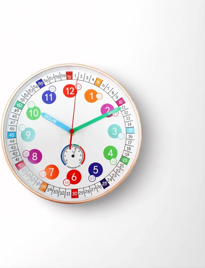 - Colorful Digital Clock Face And Simple Thermometer:The rainbow color numbers clearly marked inside,a learning clock that teaches through a 1-60 numerical scale and readable wall clock moments. Perfectly combines 12/24 hour format for effortless mastery.And there's a thermometer design.Different from other clock faces.