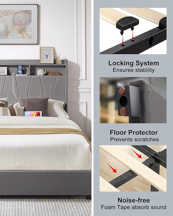 - 【King Size Bed Frame with Headboard】① King bed frame includes a built-in charging station with 2 AC outlets, 1 USB port, 1 Type-C port; ② king bed frame and headboard shelf for daily essentials such as books, phones, cameras, etc