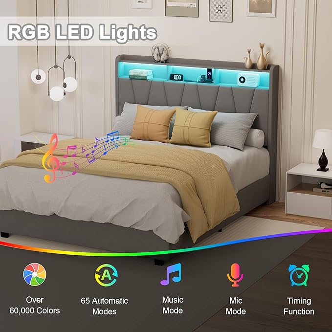 - 【Modern and Elegant】Queen bed frame with a modern design and plush velvet, featuring a headboard with storage and colorful LED lighting, adding a touch of elegance and style to any bedroom.(The velvet shifts in color depending on the angle and lighting, appearing darker in shadows and lighter in bright light.)