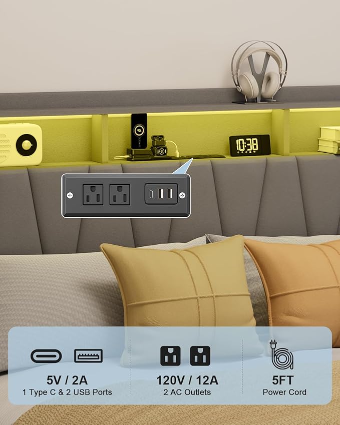 - 【Queen Bed Frame with Headboard】① Queen size bed frame includes a built-in charging station with 2 AC outlets, 1 USB port, 1 Type-C port; ② Queen size bed frames with headboard shelf for daily essentials such as books, phones, cameras, etc