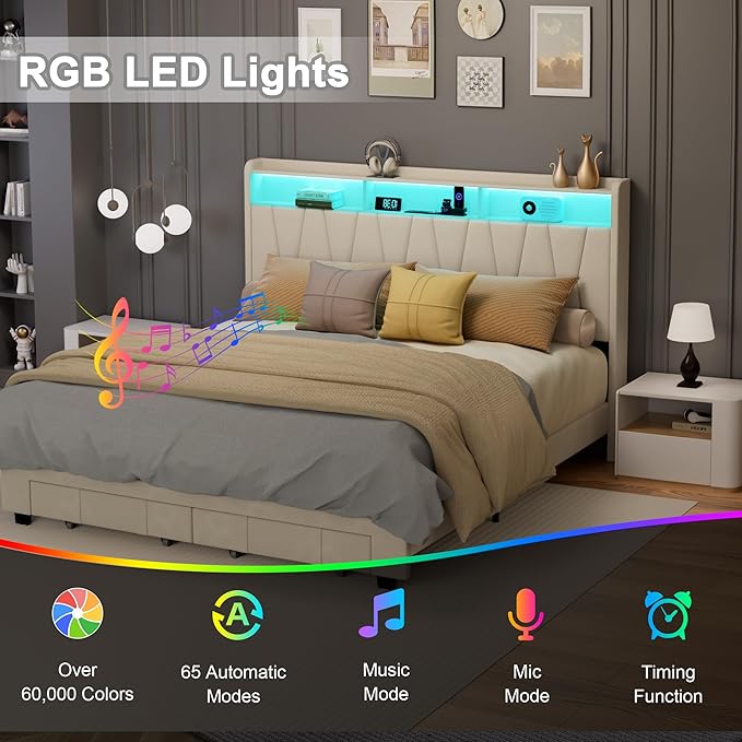 - 【Modern and Elegant】King bed frame with a modern design and plush velvet, featuring a headboard with storage and colorful LED lighting, adding a touch of elegance and style to any bedroom.(The velvet shifts in color depending on the angle and lighting, appearing darker in shadows and lighter in bright light.)