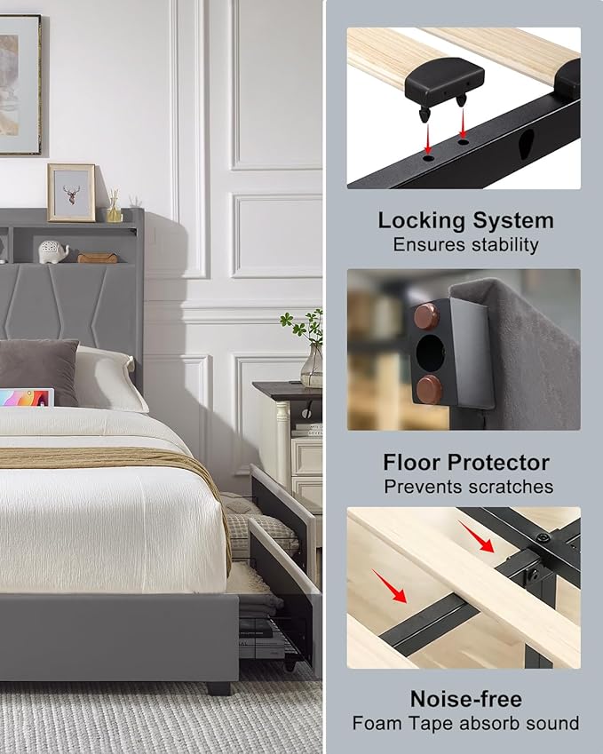 - Special Feature : Charging Station / USB Port / LED, Ergonomic, No Box Spring Needed, Squeak Resistant, Storage Drawer, Upholstered Charging Station / USB Port / LED, Ergonomic, No Box Spring Needed, Squeak Resistant, Storage Drawer, Upholstered