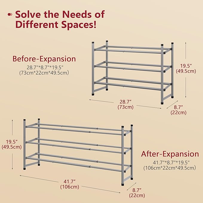 - 【Expandable & Adjustable】The size of the retractable shoe rack can be adjusted according to your needs it can hold sundries in entryway doorway, and bedroom. Dimension:28.7"W x 8.7"D x 19.5"H. Fully expanded: 41.7"W x 8.7"D x 19.5"H