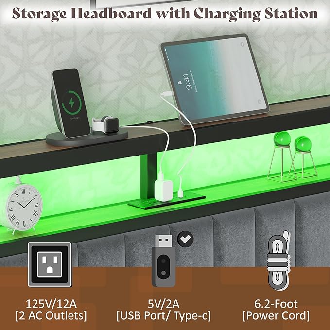 - Charging Station: Built-in 2 AC outlets, Type-C and USB ports in the headboard make it easy to charge your phones, tablets, and other electronic devices quickly and conveniently
