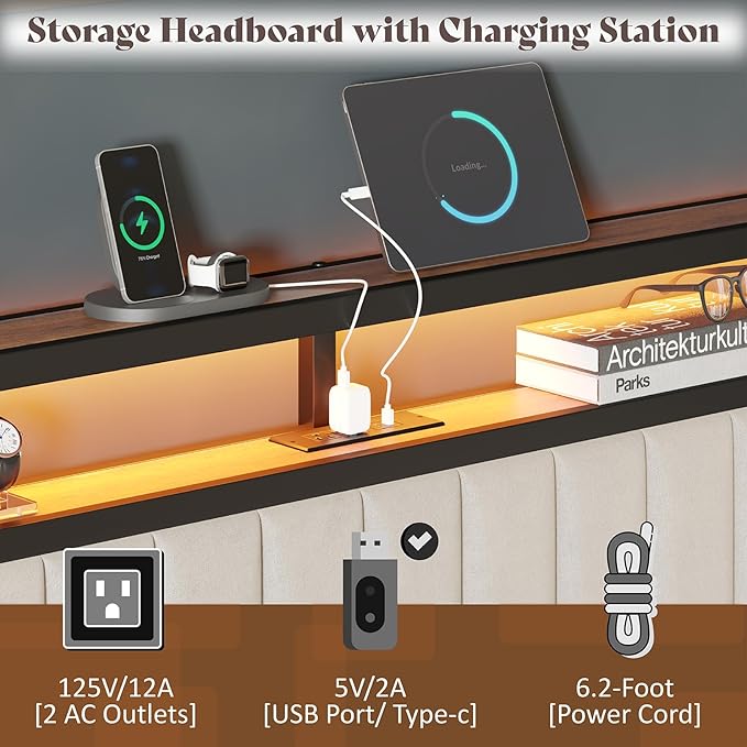 - Charging Station: Built-in 2 AC outlets, Type-C and USB ports in the headboard make it easy to charge your phones, tablets, and other electronic devices quickly and conveniently