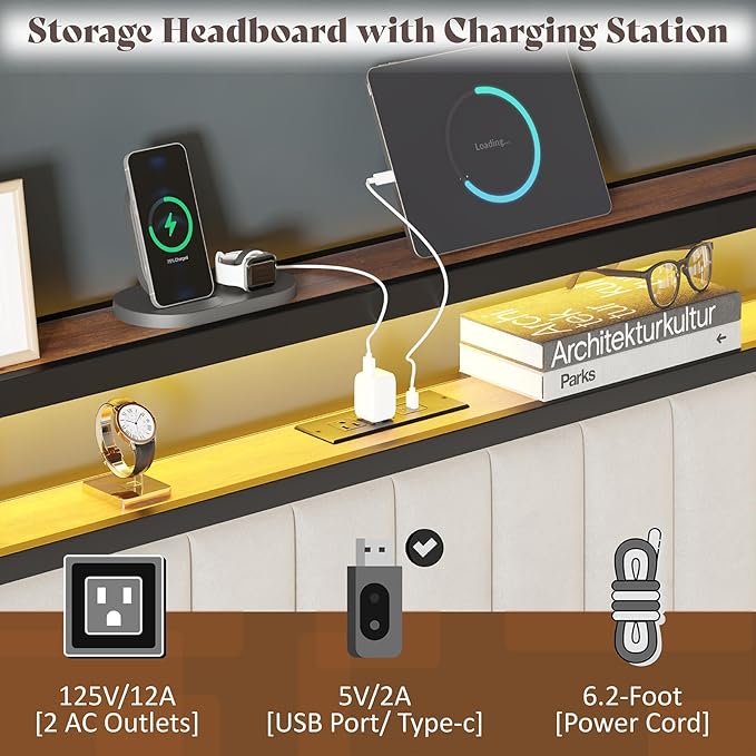 - Charging Station: Built-in 2 AC outlets, Type-C and USB ports in the headboard make it easy to charge your phones, tablets, and other electronic devices quickly and conveniently