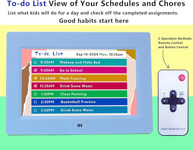 - 𝗖𝗢𝗟𝗢𝗥𝗙𝗨𝗟 𝗗𝗜𝗦𝗣𝗟𝗔𝗬 & 𝗧𝗢-𝗗𝗢 𝗟𝗜𝗦𝗧 𝗩𝗜𝗘𝗪: Featuring large, colorful letters on a clear display, this clock is easy for kids to read. Check the time or their to-do list at a glance, making organization a breeze!