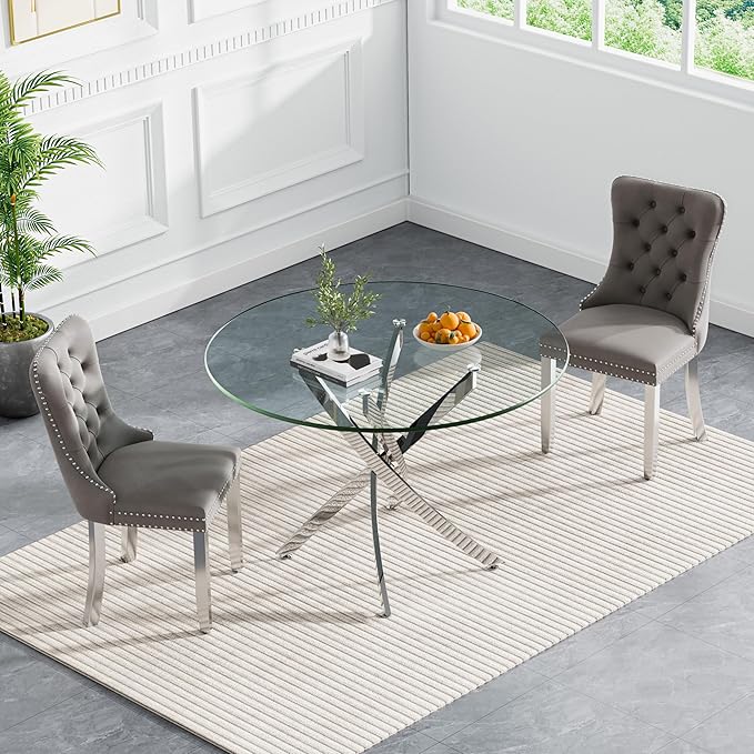 Goujxcy 3 Piece Round Glass Dining Table Set for 2, 36" Round Dining Table & Chair Set Modern Circle Glass Kitchen Table and 2 Velvet Upholstered Chairs for Kitchen Dining (Silver Table & Grey Chair)