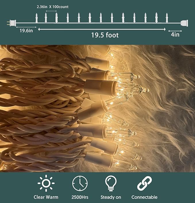 - 100 Mini Clear Bulbs String Lights: Comes with 100 mini clear bulbs for a total of 21 feet of lighted length.Complete Christmas Light set includes 2 flasher bulbs, 2 spare bulbs, and 2 replacement fuses; ideal for warm, festive holiday lighting.