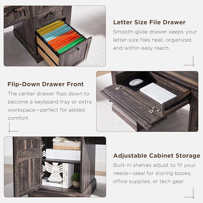 - Ample Storage for a Tidy Workspace: Keep your office organized with a large file drawer for letter-size documents, three utility drawers for supplies, and a cabinet with an adjustable shelf. A dedicated compartment also fits a vertical CPU tower—so everything has its place and stays out of sight.