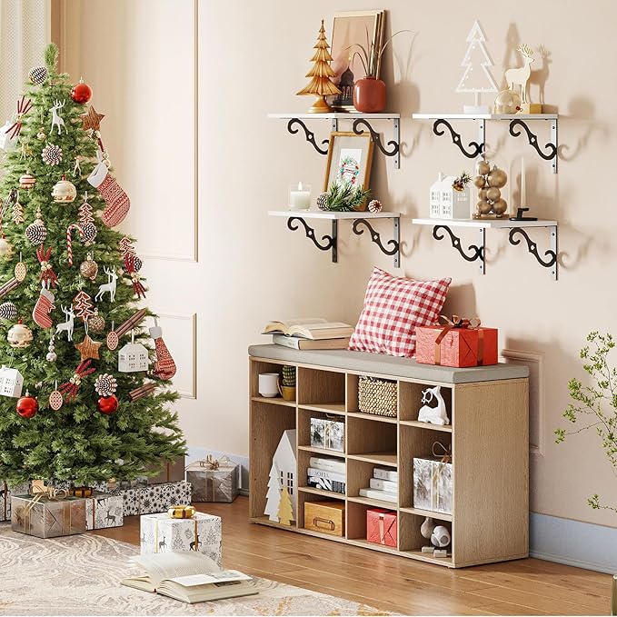 DINZI LVJ Shoe Storage Bench with Cushion, 16-Cubby Shoe Rack, Adjustable Shelves, 40.9" Long Shoe Organizer Bench for Entryway, Mudroom, Hallway, Garage, Natural and Cappuccino Beige