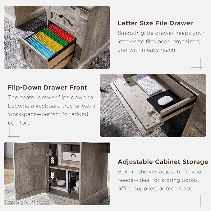 - Ample Storage for a Tidy Workspace: Keep your office organized with a large file drawer for letter-size documents, three utility drawers for supplies, and a cabinet with an adjustable shelf. A dedicated compartment also fits a vertical CPU tower—so everything has its place and stays out of sight.