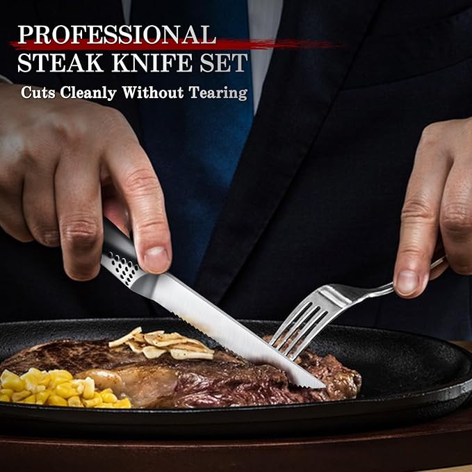 - 【Effortless Cuts, Even for Bone-In Steaks】Slice through prime rib like butter with our precision-engineered serrated blades. The 15° angled edge and micro-serrations conquer tough meats, juicy tomatoes, and crusty bread without tearing - perfect for steakhouse-worthy results at home. Whether it's Thanksgiving feasts or weekend barbecues, every cut is smooth and precise.