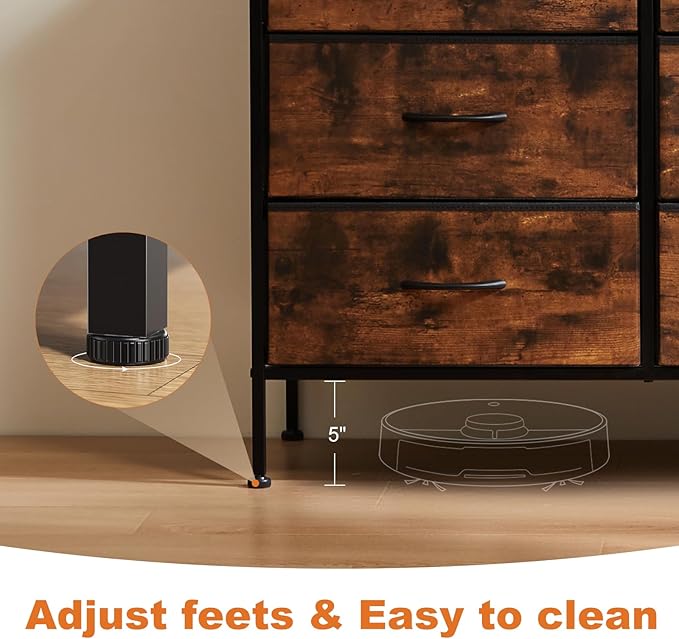 - Sturdy Frame: The high-quality metal frame extends the lifespan of the chest of drawers while keeping the chest of drawers stable and sturdy at any time. With 4 height-adjustable feet to protect your floor from scratches, you can also adjust the balance of the chest of drawers in small areas. An auxiliary function will be added if you fix the drawers dresser to the wall, as it can prevent possible tilt caused by uneven floor or children climbing.