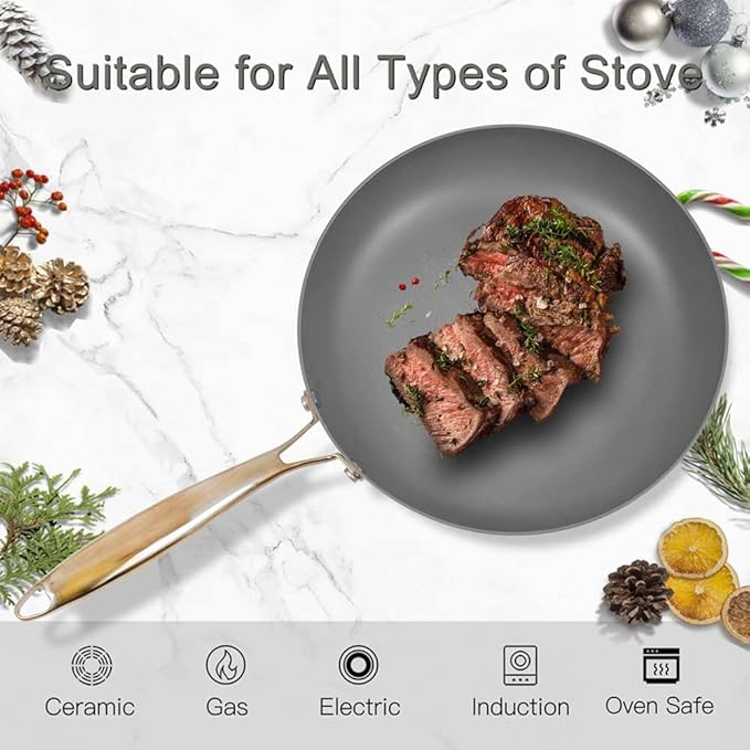 - 【Suitable for All Stove】: Heats up quickly and evenly with extended bottom design. High magnetic conductive stainless steel base allows our nonstick cookware to work on all stoves, including induction, ceramic stove, gas stove, electric stove. Oven safe up to 430°F/220°C.