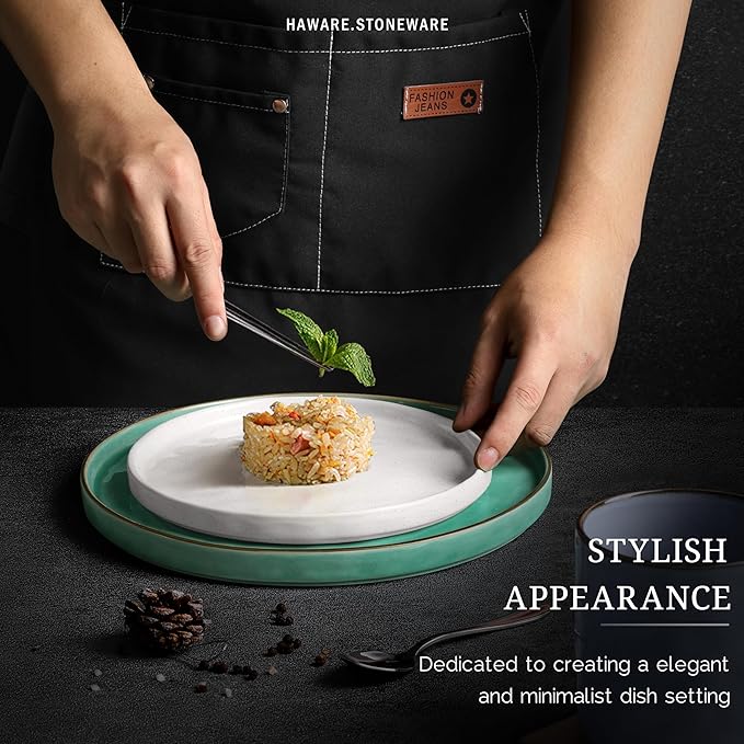 - 【PREMIUM STONEWARE】HaWare dinnerware set are made of high quality clay and glaze, NO LEAD, Non-toxic, Would not leach any harmful substance into your food or drink during using, High temperature fire-made production bring a thicker and stronger structure to the dishware, Durable and chip-resistant for long term heavy use, Also they are DISHWAHSERSAFE & MICROWAVE SAFE, Make cleaning and cooking a breeze