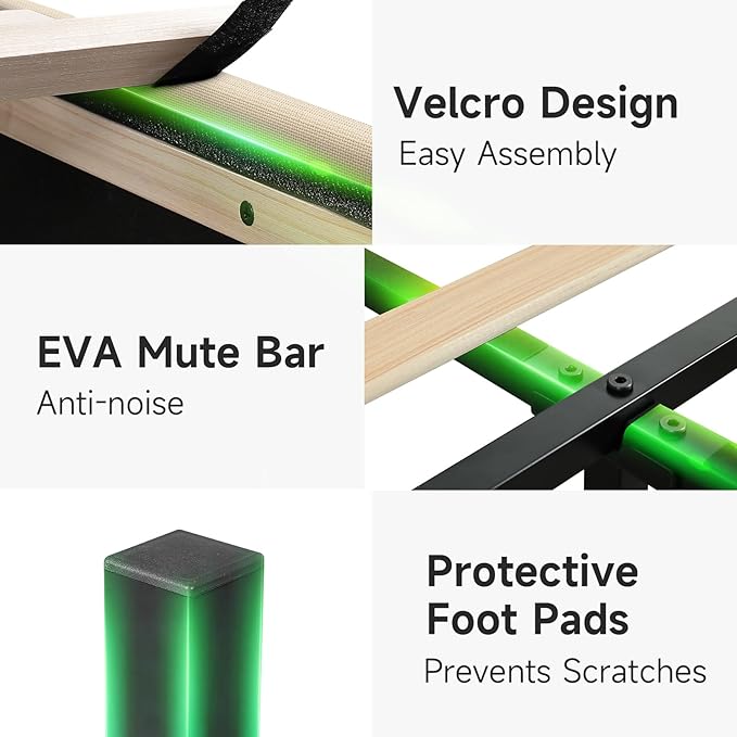 - 【Solid and noiseless 】The bed frame consists of a heavy metal frame and 12 solid wood slats, A pull bar in the middle of the headboard makes the bed frame more stable, Eight support points can support up to 800 pounds, effectively extending the life of the bed frame. Solid wood slats with Velcro and EVA mute bar, effectively avoid the noise caused by the friction between wood and metal frame, will not squeak, ensure your sleep quality!