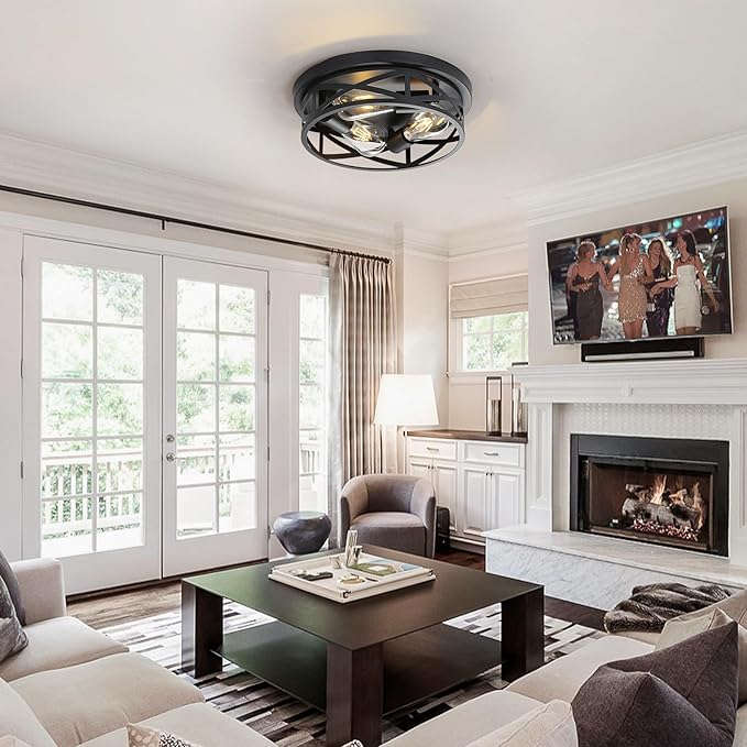 - Classic Farmhouse Cage Ceiling Light: The combination of black metal and geometric structure gives this flush mount ceiling light a sleek, industrial look, perfectly blending vintage charm with contemporary design