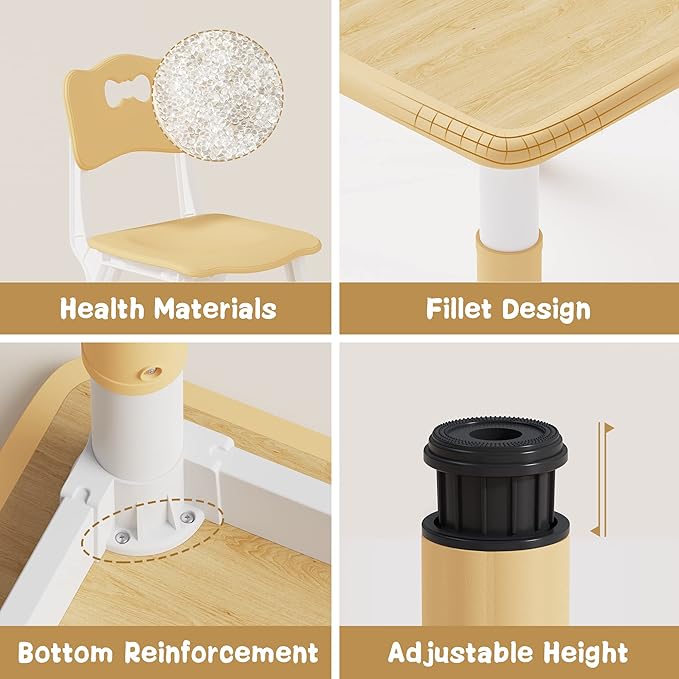 - [ERGONOMICALLY DESIGNED DESK & SEAT] The corners of the table and chairs have been rounded to avoid injury to children! The solid back of the chair protects the child's spine. The bow handle makes it easy for your child to slide in and out of the chair. The sunken seat allows the child to have the correct sitting position. The table and chairs are adjustable to fit your child's height