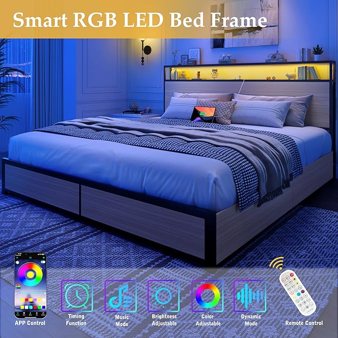 - 【RGB LED Light Bed Frame】This Bed frame is equipped with RGB LED light belt, you can use the equipped remote control or mobile APP to set the LED color, brightness, mode, timing function, etc., to meet the needs of different styles and different scenes, make your home life more colorful. The LED function comes with detailed instructions, and you can follow the instructions to complete the corresponding settings.