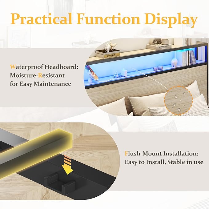 - 【Storage Headboard with Charging Station】The headboard is equipped with a built-in charging station, including 2 AC Outlets, a USB port and a type-C port, allowing you to charge various electronic devices within easy reach. 2-Tier Storage shelf on the headboard can provide more storage space, making it convenient for you to place commonly used items such as magazines, phones, alarm clocks, etc