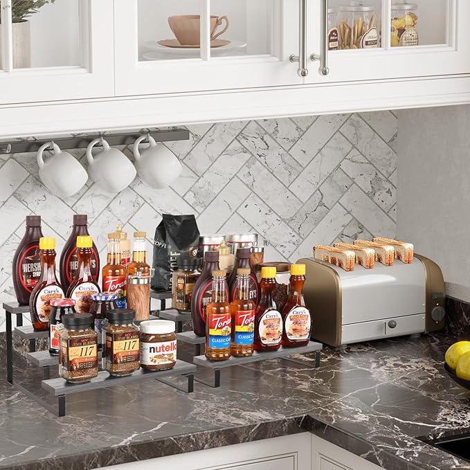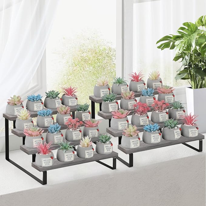 - Quick Setup & Easy Cleaning: You can have this 4-tier display riser stand assembled in 10 minutes with detailed instructions and tools. The wooden surface is waterproof and dust-free, a damp cloth could keep the counter shelf clean. (Assembly tools and accessories are included in the package)