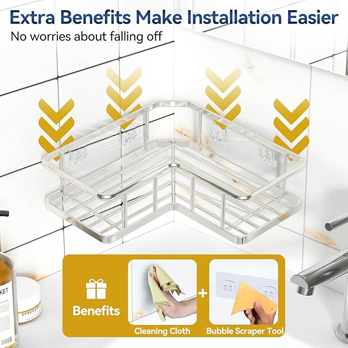 - NO TOOLS & EASY INSTALLATION:Install this rust-proof shower caddy corner in minutes: Clean surface → Apply industrial-grade adhesive → Hang & wait 24hrs. Contains 7 sets of adhesive stickers suitable for smooth tile/glass/marble (not suitable for textured walls)