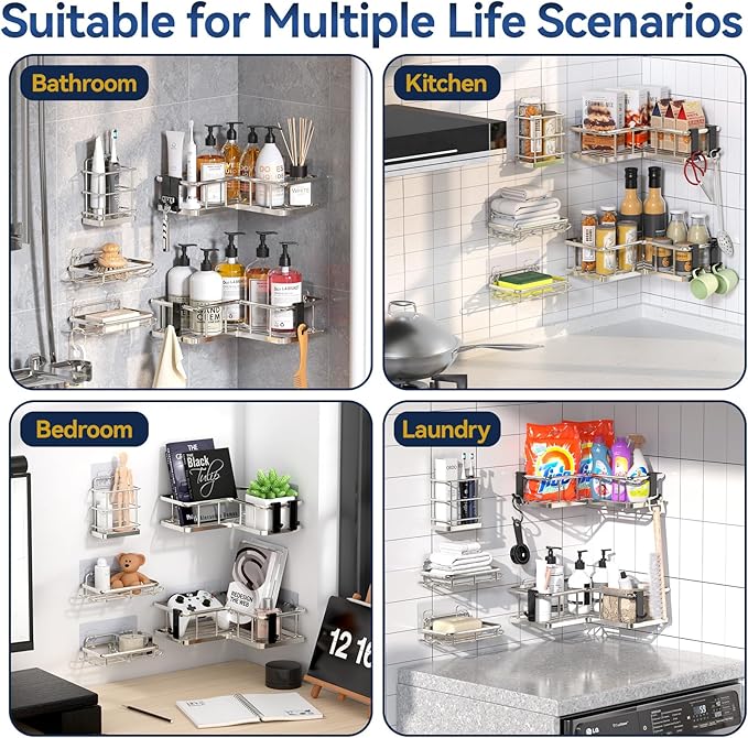 - 5-IN-1 SHOWER ORGANIZER SET:Upgraded L-shaped corner shower shelf maximizes unused 90° wall space with 30% larger capacity than standard models. Holds 19+ full-size shampoo bottles (40lbs) - perfect for bathroom essentials, kitchen spices, or RV storage. The ultimate shower organizer for clutter-free living