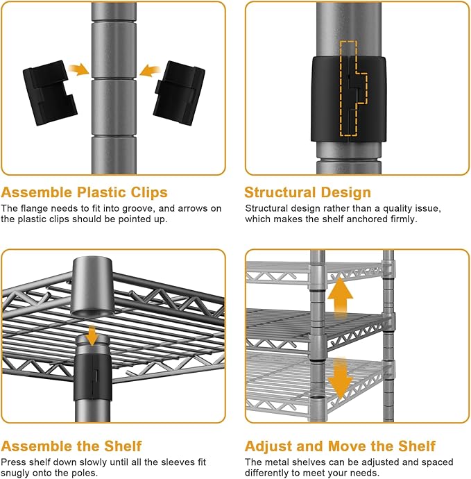 - [Easy to Assemble]: The closet organizer storage system is easy to assemble. Read the assembly guidelines carefully before you start putting it together. Plus, a rubber hammer (NOT INCLUDED) is recommended to hit the shelf edge to make sure the shelf cone sleeves and plastic clips fit snugly, which can prevent the clothing rack from being wobbly