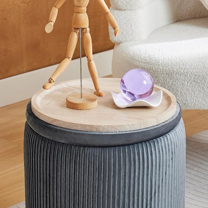Round Ottoman with Storage Set of 2-Upholstered Velvet Vanity Stool for MakeupMultifunctional Ottomans Coffee Table Padded Seat Foot Rest for Living Room&Bedroom(Light Grey-Upgrade Tray Lid)