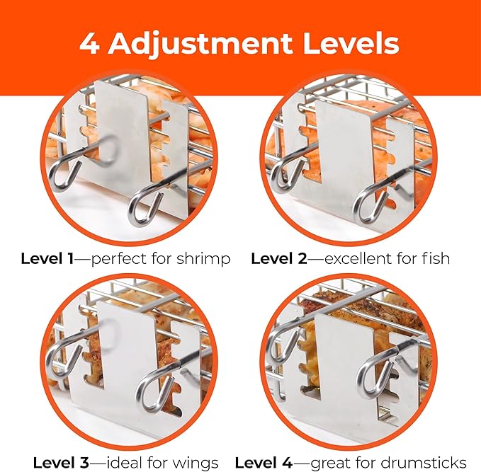 - Adjusts to 4 Levels: This adjustable grill basket lid locks into 4 positions to fit everything from sliced vegetables to thick cuts of meat. Great for fish, drumsticks, and more.