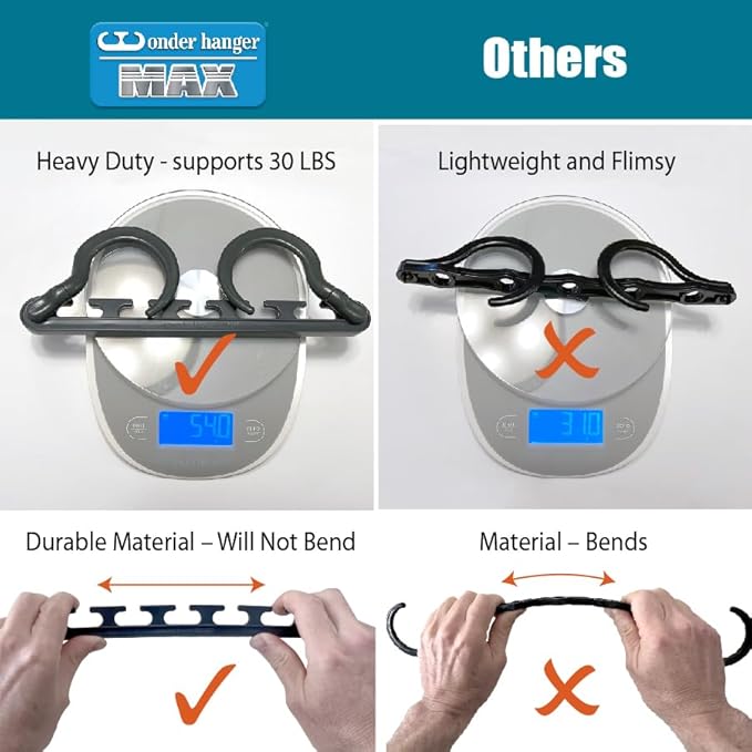 - HEAVY-DUTY DESIGN: Built from heavy-duty, reinforced plastic, the Wonder Hangers are made to last and durable enough to hang heavy jackets, tablecloths, and throw blankets. Crafted from durable materials, it can hold up to 30 lbs per hanger. It's strong enough to hold your bulkiest winter wear yet versatile enough to hang your entire wardrobe with ease. The Wonder Hanger Max is designed to hold a tremendous amount of weight and is arranged vertically to maximize closet space.
