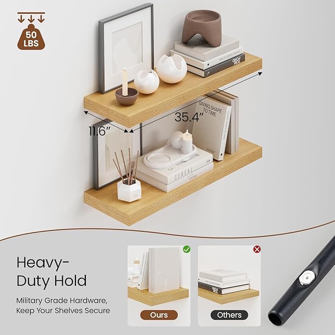 - Extra Deep Floating Shelves: Measuring 11.6” D x 35.4” W x 1.5” H, these shelves are crafted for maximum depth and durability. The spacious 12” depth gives you plenty of room for stylish display, organized storage, and decorative accents. Perfectly suited for your bathroom, kitchen, or living room, they enhance both function and flair in any space!