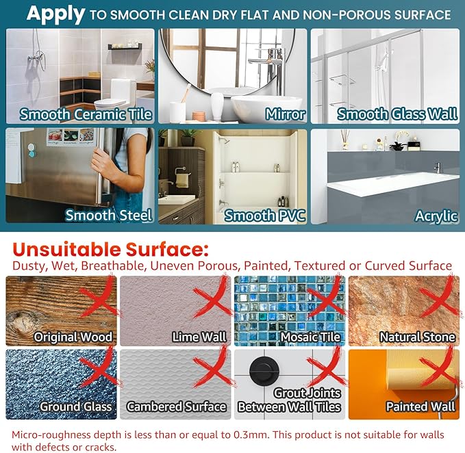 - Warm Tip: This shower organizer works best for non-porous, impervious, smooth surfaces such as glass, mirror, polished metal, stainless steel, plastic board, wall tile, grainy granite, etc. Please remind that don't stick to a grout line. If problems when firstly installation, please wash the suction cup, dry it with hair dryer and test it on the smooth glass surface. If suction holds, that means initial wall might not applicable for using suction cup, please change installation location.