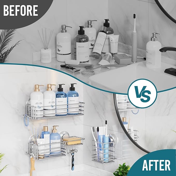 - Powerful & Durable Suction: TPE Suction Cup with bionic design of octopus tentacles and ABS plastic Hook ensures weather proof(-4°F-174°F), waterproof, and anti-aging; bathroom shower organizer with thicken plastic can hold up to 10KG / 22lbs and stick sturdy for years after installation without any concerns.