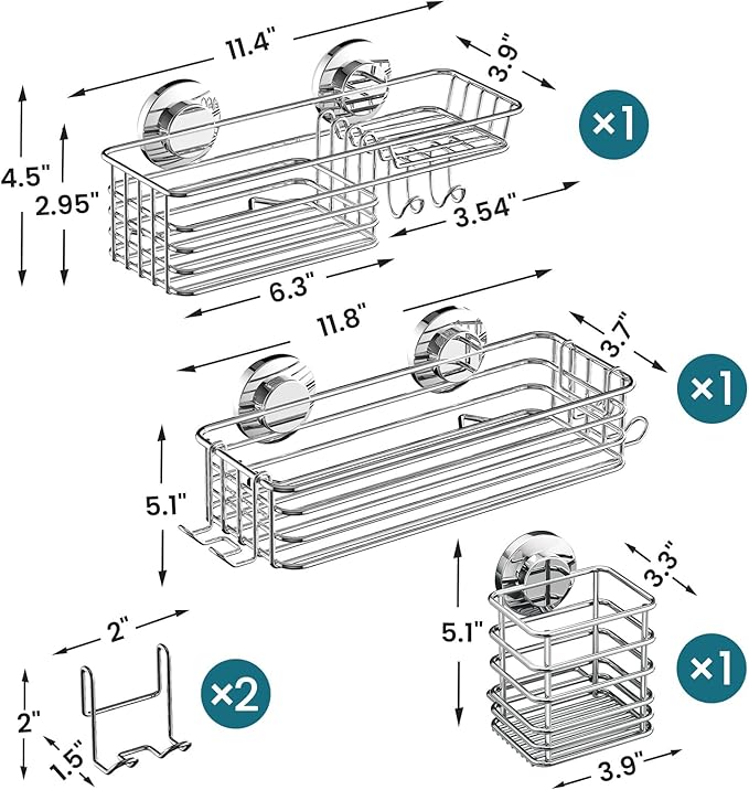 - Humanized Hooks and Soap Holder: Large capacity for shampoo, shower gel, cosmetics, hair conditioner, hand washing liquid and soap. Also shower basket includes 1 large size hook, you can hand your razors, towels, brushes on it. The shower holder organizer works great in the shower/ bathroom/ bathtub/ kitchen/RV and more, meet all your storage requirement.