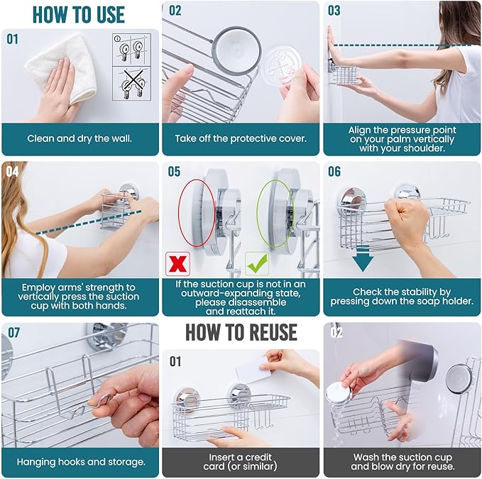 - Warm Tip: This shower organizer works best for non-porous, impervious, smooth surfaces such as glass, mirror, polished metal, stainless steel, plastic board, wall tile, grainy granite, etc. Please remind that don't stick to a grout line. If problems when firstly installation, please wash the suction cup, dry it with hair dryer and test it on the smooth glass surface. If suction holds, that means initial wall might not applicable for using suction cup, please change installation location.