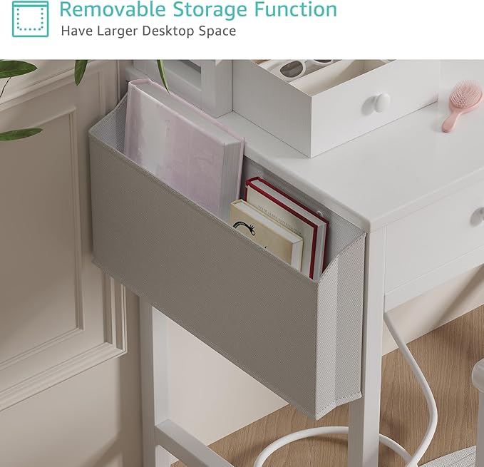- Ample Storage Solutions: Say goodbye to clutter with 2 large fabric drawers, 2 small tabletop drawers, a side pocket, and hooks—perfect for organizing your makeup, skincare, and accessories, keeping everything tidy and accessible