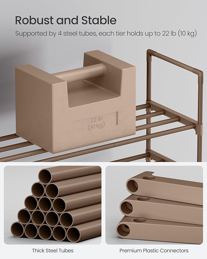- 【ROBUST AND DURABLE】Connected by quality plastic connectors, this shoe organizer made of thick metal tubes holds up to 22 lb per tier, giving your footwear a reliable home