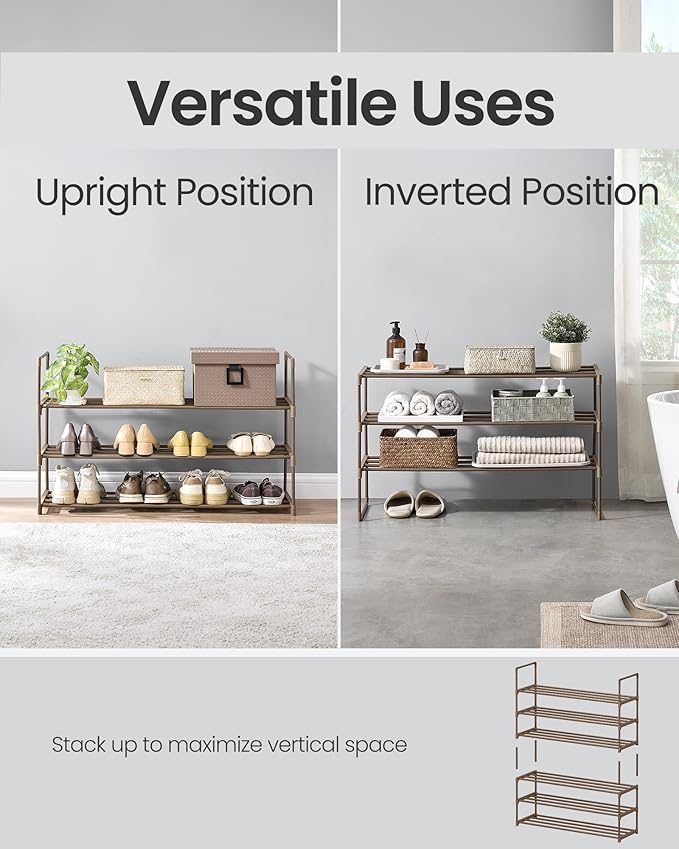 SONGMICS Shoe Rack, 3-Tier Shoe Organizer, Metal Storage Shelf, Upright or Upside Down, for 16-20 Pairs, Stackable, for Entryway, 11.8 x 36.2 x 21.7 Inches, Walnut Brown ULSA303K01
