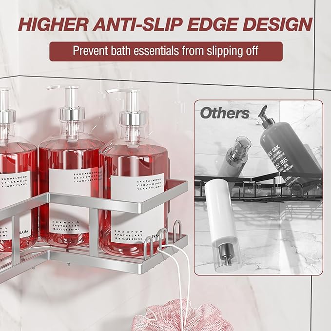 - Space-Saving Design: The L-shaped corner design makes full use of corner space. The shower caddy can support up to 40 lbs, equivalent to 19 bottles of 34oz shampoo, body wash, or lotion. The raised anti-slip edges secure your items, prevent slipping, and ensure safety with every use.