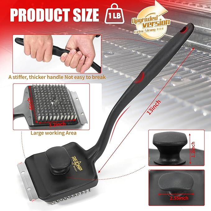 - 【Ergonomic Design】 The upgraded grill cleaning brush is equipped with an extended and thickened handle, preventing users from easily breaking it or frequently adjusting their posture or position while cleaning the grill. The innovative anti-slip grip ensures a stable hold during the cleaning process, preventing slippage and making it more effortless and efficient.