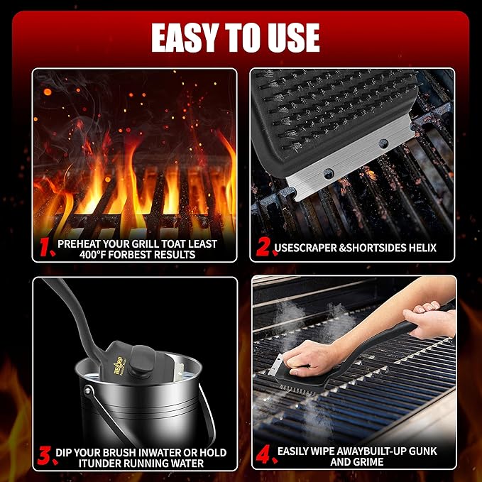 - [Safer and No-Wire-Loss]: This grill brush incorporates advanced fastening technology to ensure that the wire bristles are securely anchored to the brush body, thereby significantly reducing the risk of wire detachment. Compared to other products on the market, this design provides superior performance and reliability. Engineered for safety and efficiency, this BBQ brush ensures a dependable, effective cleaning experience.