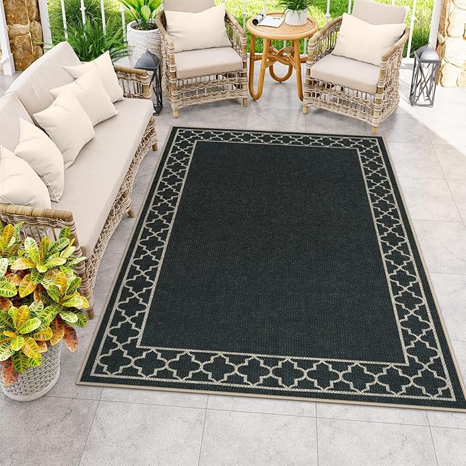 OJIA Easy Jute Washable Rugs 5x7 Outdoor Rug, Modern Area Rug Patio Rug Living Room Rugs Bordered Indoor Outdoor Rug Farmhouse Non-Slip Carpet Geometric Black Rug for Backyard Dining Room