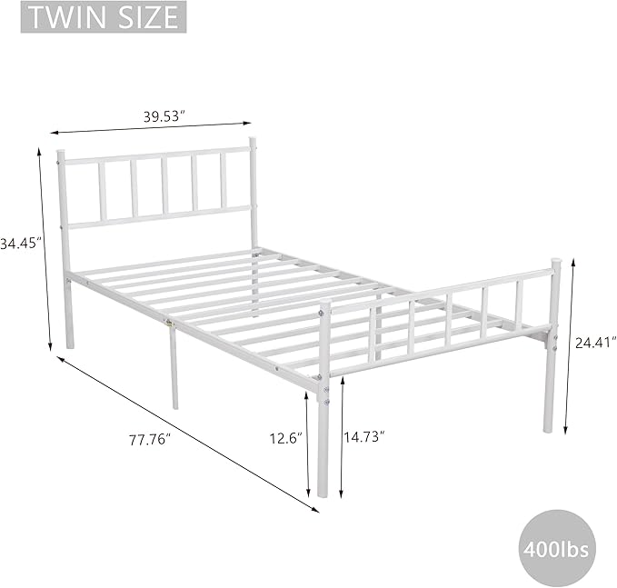 Metal Platform Twin Bed Frame with Headboard Sturdy Steel Slats Support No Box Spring Needed Easy Assembly White