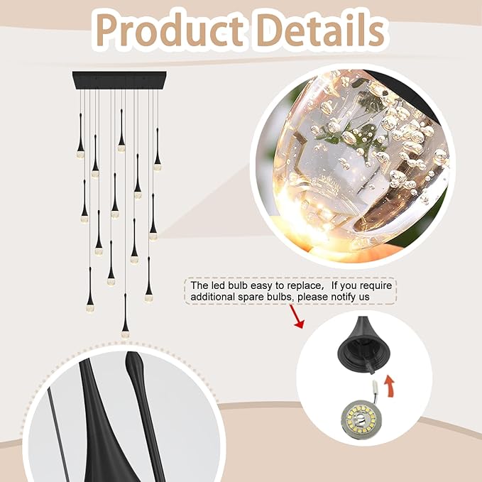 - 【Staircase Chandelier Easy to install】:all wires are pre-wired and pre-threaded. Just need to install the fixture into the ceiling box, then assemble the crystal pendants. Please check the dimensions of the product before ordering to ensure it fits your home.