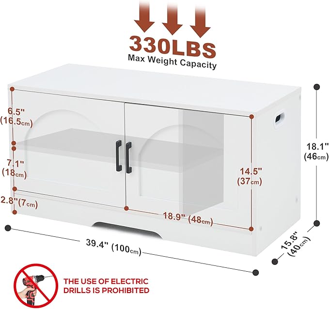 Storage Bench, 39.4" Shoe Bench with Storage, 2 Tier Entryway Bench with 2 Doors, Adjustable Shelf, 39.4" W x 15.8" D x 18.1" H, Holds up to 330lbs for Entryway Living Room Bedroom Hallway, White